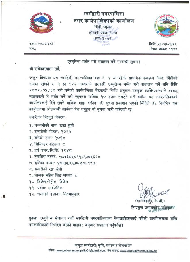 एम्बुलेन्स मर्मत गरि संचालन गर्ने सम्बन्धी सूचना
