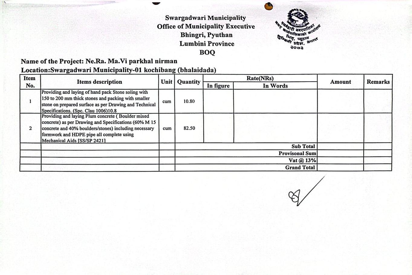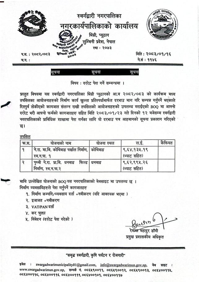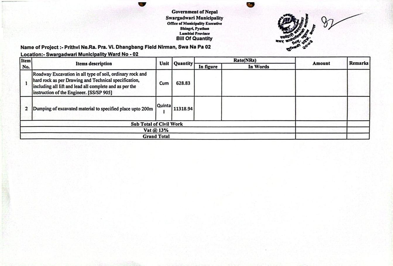 दर रेट पेश गर्ने सम्बन्धमा