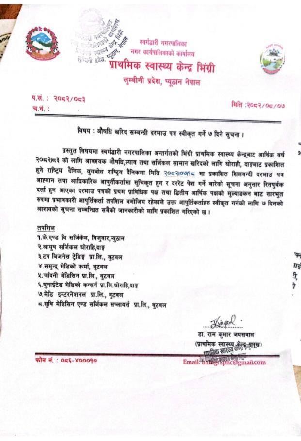 औषधि खरिद सम्बन्धी दरभाउ पत्र स्वीकृत गर्ने सुचना